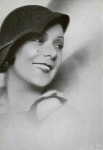 wearing a green felt trimmed hat designed by Le Monnier, 1931